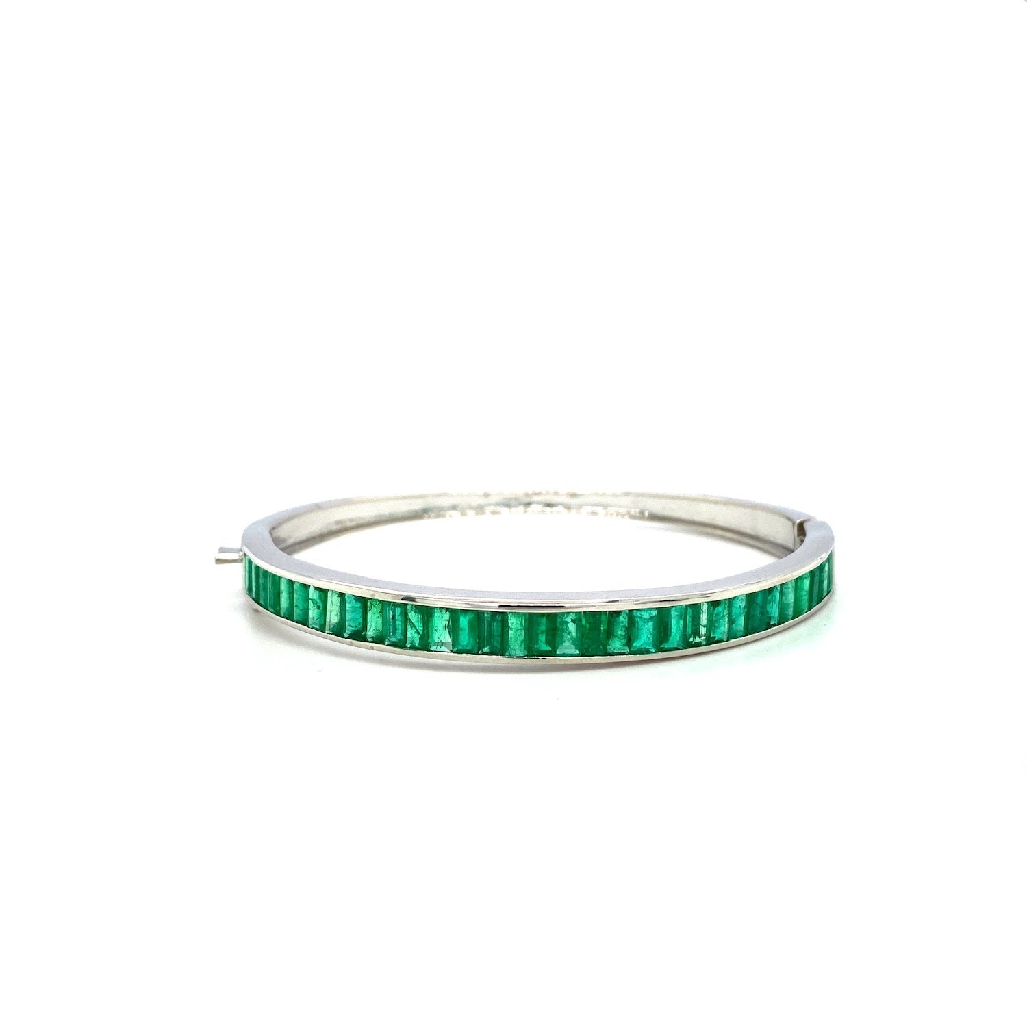 A queue of precisely cut emeralds sitting in channel setting of .925 sterling silver. Simple yet elegant, making for a staple piece in daily accessories.