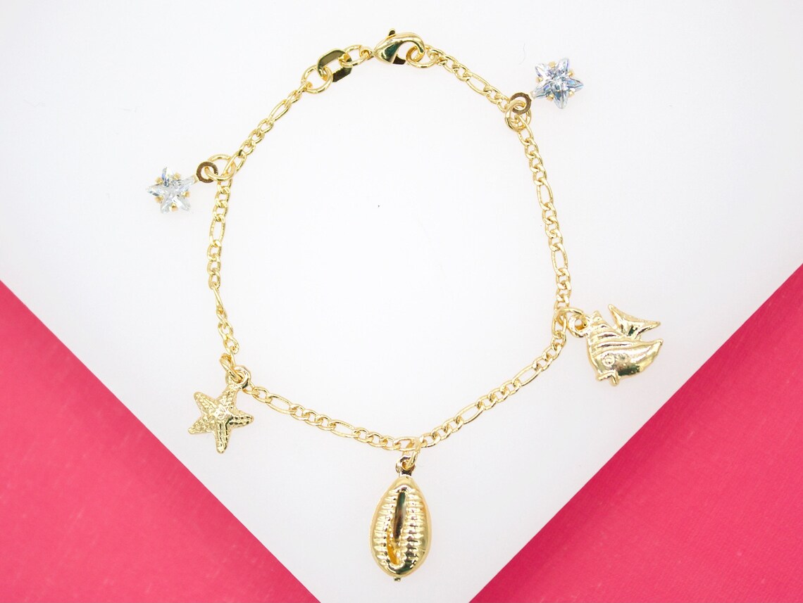 18K Gold Filled Dangle Star Cz Puka Shell Fish Charm Bracelet (XX15)