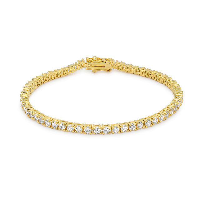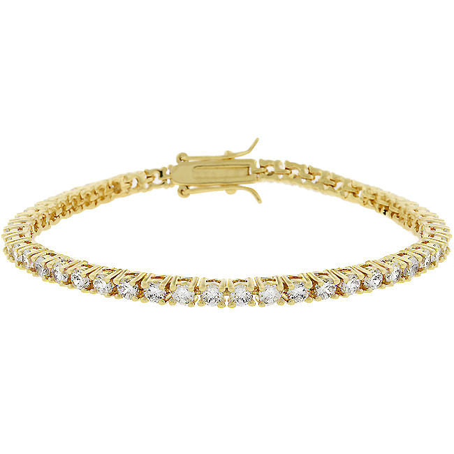Base Metal: Lead Free Alloy (brass) Style: Classic Setting Type: Prongs Materials: Cubic Zirconia Stone Cut: Round Carat Weight: 11.4 (ct) Plating Color: Goldtone Finish Bracelet Clasp: Lock Stone Size: 3 (mm) X 3 (mm) Product Dimensions: 8 Inch