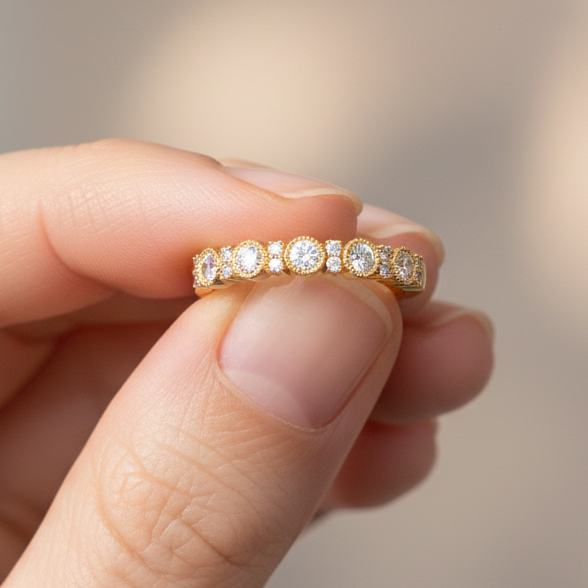 Round Cut Half Bezel Stud 14K Solid Gold Diamond Wedding Ring Band