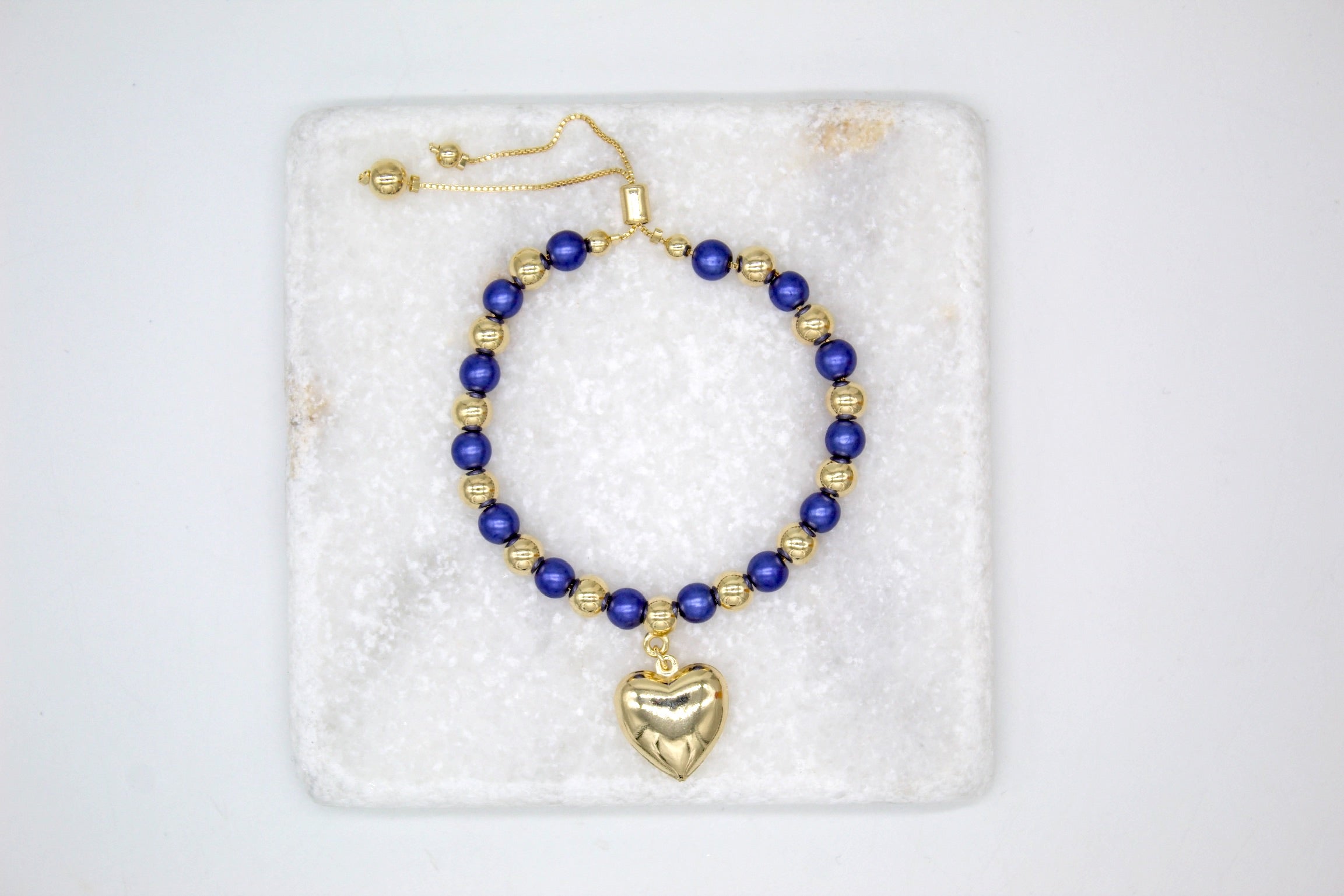 18K Gold Filled Heart Charm Gold Blue Beaded Adjustable Bracelet (I400)